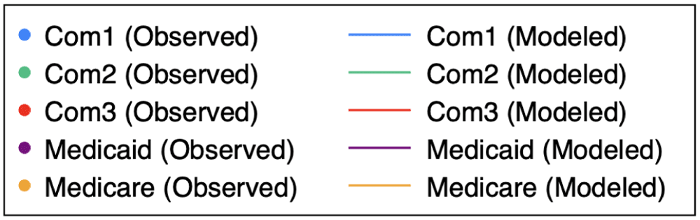 Figure 1: Shows color labeling for modeled and observed data by insurer type.