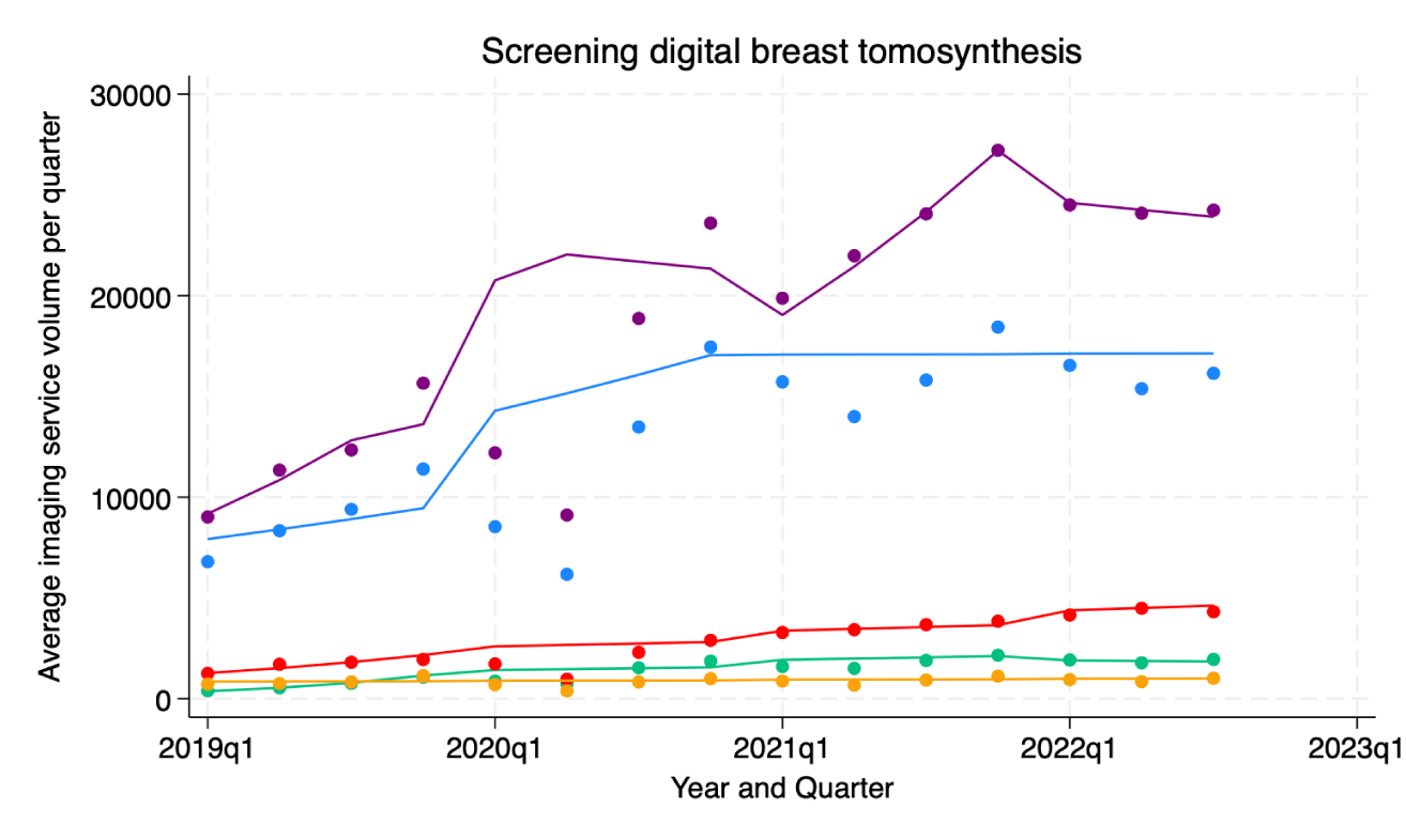 Analysis began by deidentifying the monthly data volumes of the five breast imaging modalities and documenting the insurance payor details. The quarterly mean volumes and standard errors of each breast imaging service and insurance type were then calculated using STATA version 18.0 [11].