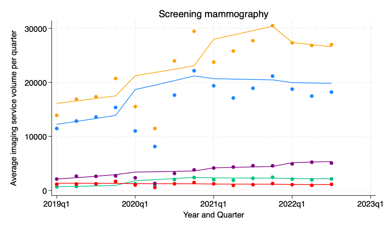 Figure 5: Trends in 2D screening mammography service volumes (2019Q1–2022Q3) by insurer type.