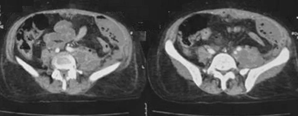 Physical examination showed tenderness and guarding over the left lumbar region with fullness. The patient did not have any associated signs of urinary or gastrointestinal disease.