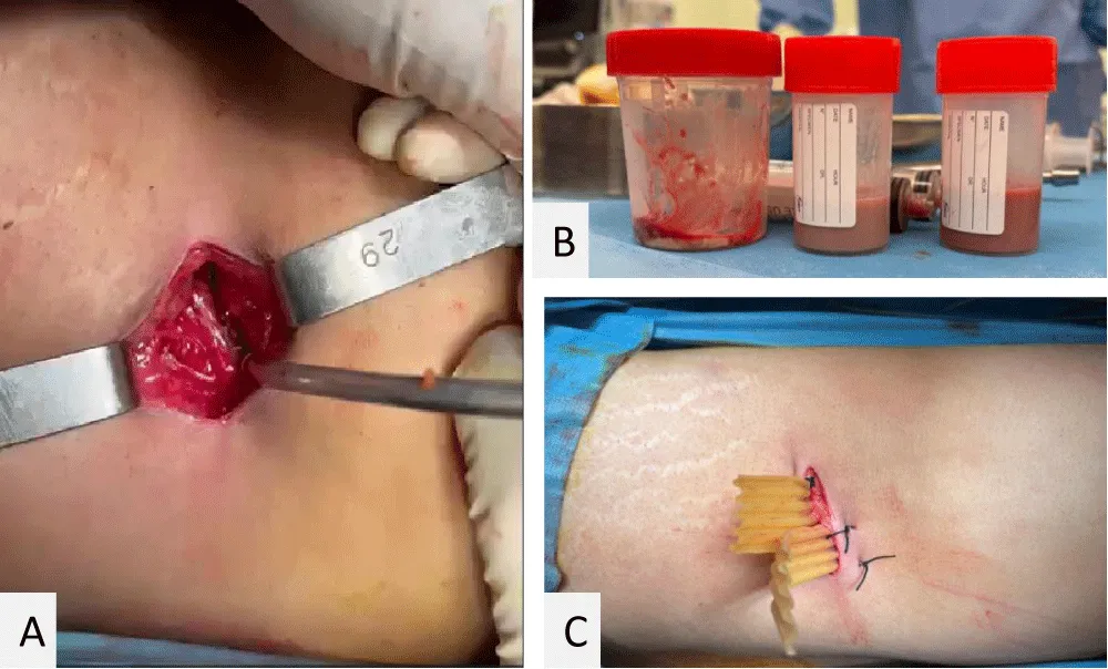 Figure 2: ER drainage of left psoas abscess: (A) mini-lumbotomy; (B) ~1 L pus; (C) Delbet drains.
