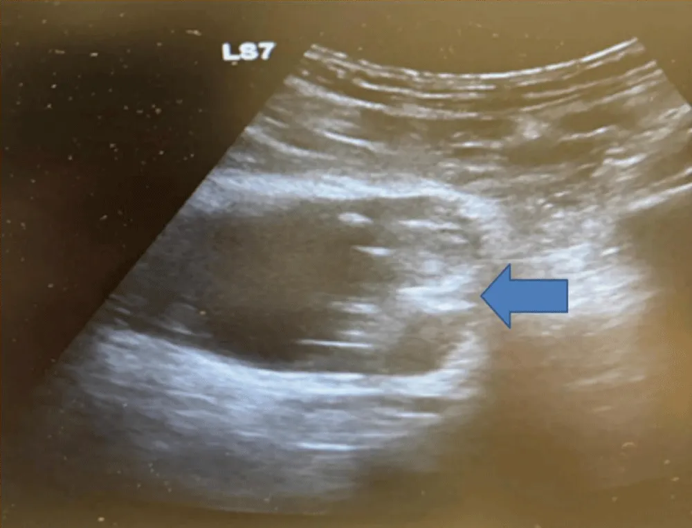 Figure 1: Radiological Assessement. Abdominal ultrasound showing a well-defined sessile, non-mobile, and mildly vascularized echogenic intravesical mass arising from the left lateral bladder wall.