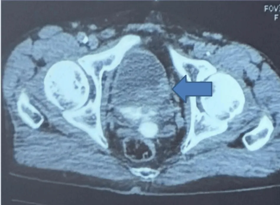 Figure 2: Computed Tomography Findings. Axial contrast-enhanced CT scan confirming a well-circumscribed intravesical soft tissue mass measuring 3.0 × 2.6 cm with homogenous enhancement and no signs of perivesical fat Invasion. The lesion was located on the left lateral wall, distinct from the ureteral orifice and the bladder neck, explaining the absence of upper tract dilatation.
