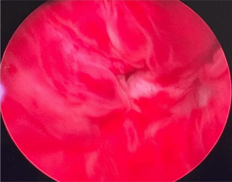 Figure 3: Endoscopic Appearance. Cystoscopic image showing a non-papillary polypoid sessile lesion with a smooth surface, approximately 3 cm in size, located in the left lateral bladder wall.